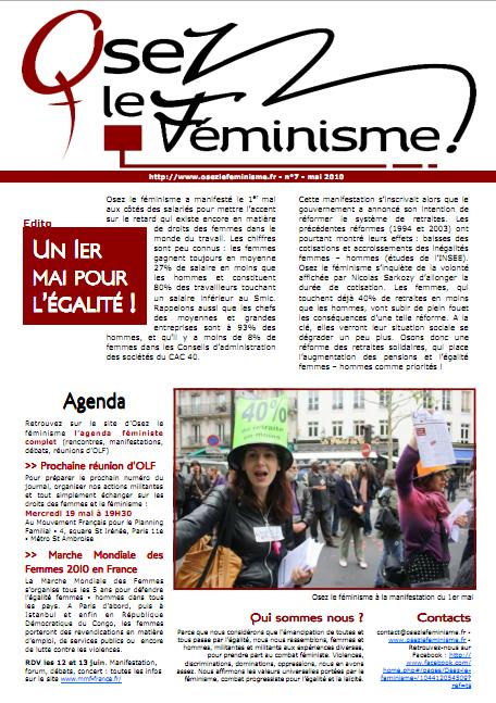 Un 1er mai pour l'égalité ! Osez le féminisme a manifesté le 1er mai aux côtés des salariés pour mettre l’accent sur le retard qui existe encore en matière de droits des femmes dans le monde du travail. Les chiffres sont peu connus : les femmes gagnent toujours en moyenne 27% de salaire en moins que les hommes et constituent 80% des travailleurs touchant un salaire inférieur au Smic. Rappelons aussi que les chefs des moyennes et grandes entreprises sont à 93% des hommes, et qu’il y a moins de 8% de femmes dans les Conseils d’administration des sociétés du CAC 40. Cette manifestation s’inscrivait alors que le gouvernement a annoncé son intention de réformer le système de retraites. Les précédentes réformes (1994 et 2003) ont pourtant montré leurs effets : baisses des cotisations et accroissements des inégalités femmes – hommes (études de l’INSEE). Osez le féminisme s’inquiète de la volonté affichée par Nicolas Sarkozy d’allonger la durée de cotisation. Les femmes, qui touchent déjà 40% de retraites en moins que les hommes, vont subir de plein fouet les conséquences d’une telle réforme. A la clé, elles verront leur situation sociale se dégrader un peu plus. Osons donc une réforme des retraites solidaires, qui place l’augmentation des pensions et l’égalité femmes – hommes comme priorités !