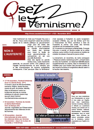 Le lancement en novembre de notre campagne "Places en crèche - la loterie ça suffit", s'inscris dans ce refus de l'austérité : en réclamant 500 000 places supplémentaires en crèche, Osez le féminisme ! se mobilise pour que l'action des pouvoirs publics et les moyens humains soient à la hauteur des besoins.